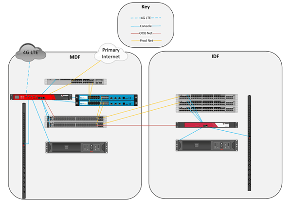 Routing for the OOB network is handled by the Infrastructure Manager, and accessed either through the primary internet circuit, or if that circuit or internet switch is down, though the built-in 4G LTE radio. Additionally, OpenGear has a feature called Cascade Ports, where the IM can manage the serial connections of all other console servers connected to it. This means the Infrastructure Manager can manage all console connections across each IDF.